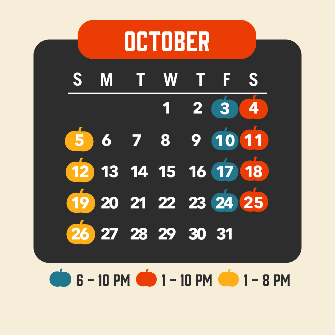Every Saturday: 1pm - 10pm Every Sunday: 1pm - 8pm Open Fridays starting October 3: 6pm - 10pm